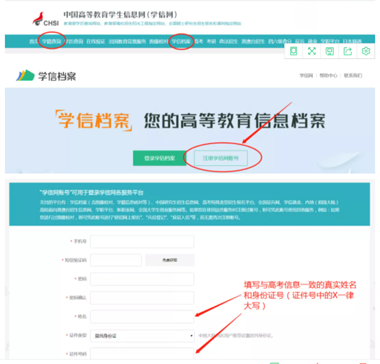 进入学信网,点击“学籍查询”或“学信档案”,进入学信档案页面后,点击“注册学信网账号”进行实名注册,如下图;如已注册请输入账号(手机号)和密码,进入核对页面。