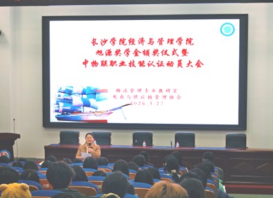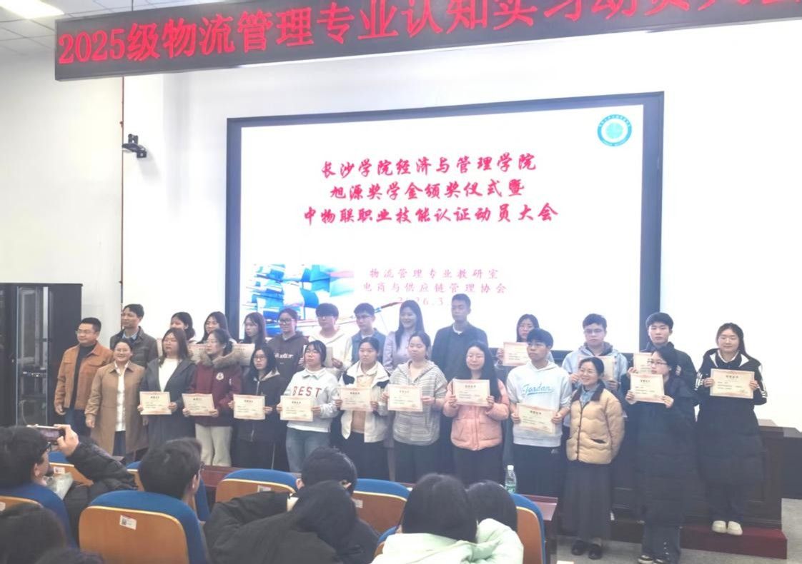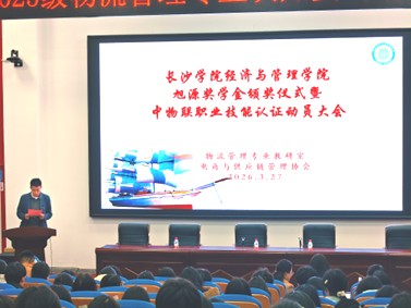 3月27日,长沙学院经济与管理学院2025年度“旭源励志奖学金”颁奖仪式暨中物联职业技能认证动员大会在经管大楼B405举行。学院党总支书记詹琳、副院长全春光、2008级优秀校友张旭及部分师生代表共同参加活动。仪式由物流管理国家一流专业建设点负责人杨芳教授主持。