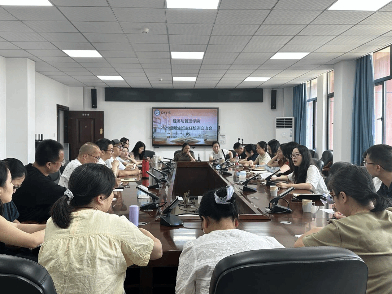 为扎实推进2025级新生迎新工作筹备,切实提升2025级新生班主任的工作能力与专业素养,筑牢学院新生教育管理工作基础,9月2日下午14:30,经济与管理学院在经管大楼B515会议室召开2025级新生班主任培训交流会。长沙学院原党委副书记刘寒波教授作为25数字经济1班班主任出席会议,全体新生班主任、辅导员共同参会。会议由学院党总支副书记谭寅寅主持。