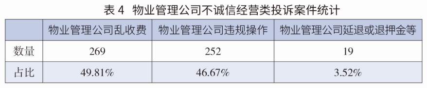 物业管理公司乱收费和违规操作是不诚信经营行为的主要表现。其中,乱收费行为所占比例达到49.81%,违规操作占比46.67%,这说明在业主看来,物业管理公司需要对收费行为和违规操作行为进行约束,在公共收益这一方面要进行公示,依法依规经营。
