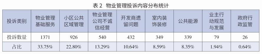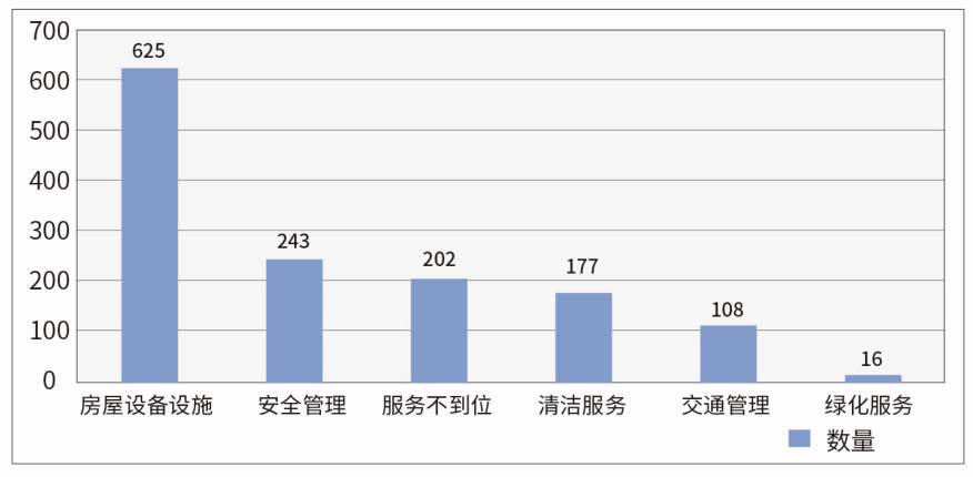物业管理是准公共管理,数据显示,日常公共管理的投诉所占比例为67.28%,说明此类问题是物业管理的重点与难点,主要集中在“破坏绿地、电梯超载、占道、破坏公共设施等”现象上,而物业管理公司只有规劝、提醒、要求整改的权利,没有强制执法权,小区的维护不仅仅是物业管理公司的责任,业主也要主动担起责任来,减少破坏公共设施设备的行为。