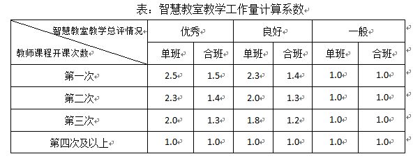为鼓励教师使用智慧教室教学,从2021-2022-1学期起,在智慧教室上课的教学工作量计算方法改为:先根据《长沙学院教学工作量计算办法》计算出在智慧教室上课的课时数,再乘表“智慧教室教学工作量计算系数”中的系数得到。从2021-2022-1学期起, SPOC课程(MOOC课程)的教学工作量将不再计算慕课系数。